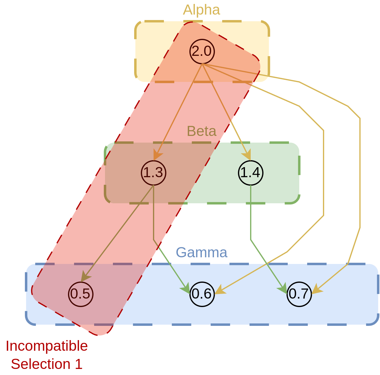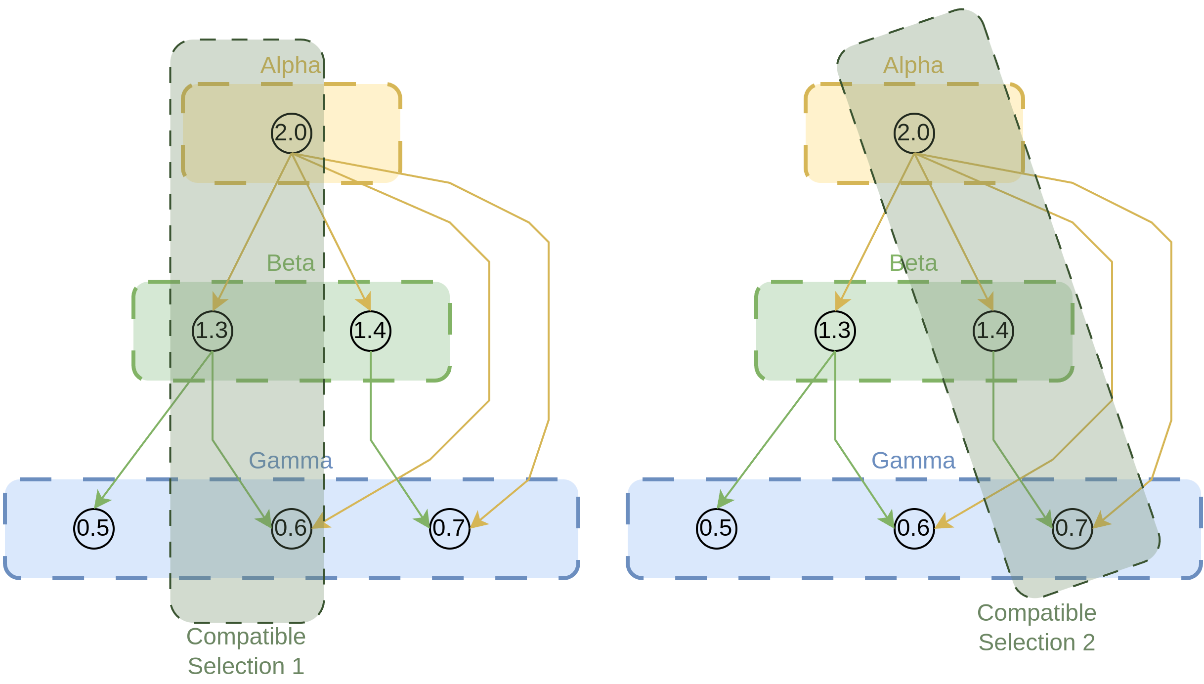 Figure 2. Based on our conditions and dependencies, we can have two compatible selections: (i) Alpha-2.0, Beta-1.3 and Gamma-0.6