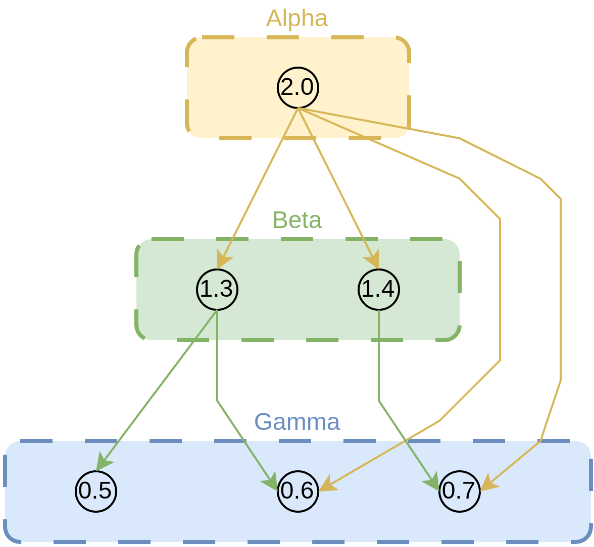 Figure 1. Dependency graph: A graph depicting the dependencies of the packages. Each box represents a package and each circle inside the box represents a version. We can consider each package and version combination as a different package altogether. Hence, we consider a version-specific package (e.g. Beta-1.4) as a vertex and create a directed edge from the package to another version-specific package on which the former depends on.