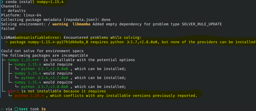 When there is no option for upgrading/downgrading in an unsatisfiable situation, package manager would raise error stating that the requirements are not satisfiable. Check Figure 6 for an example of such a situation with the conda package manager